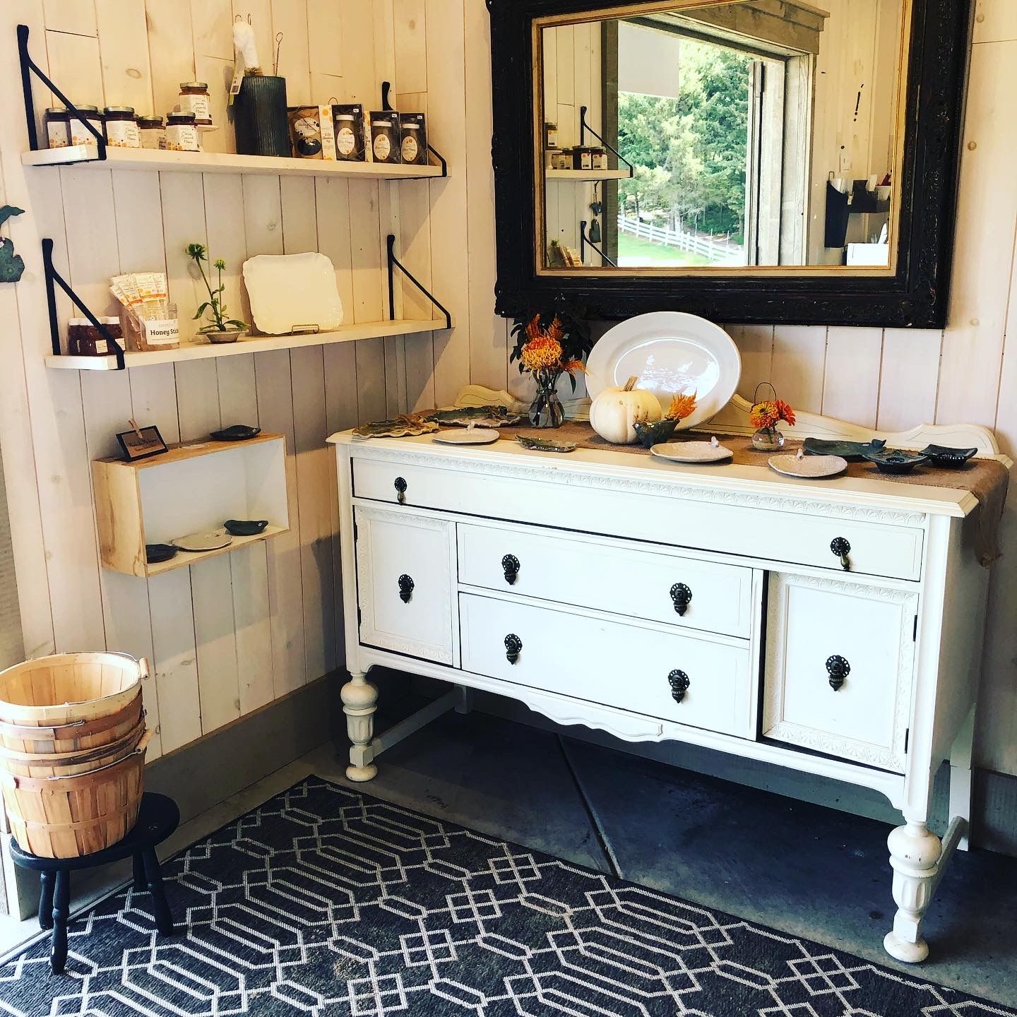 Our check-in stand expanded with more flower helps and gifts with some of my favorite things: Sister Bee's "Honey" Products, Carla Aligood's hand-made flower vases, frogs, stoneware (seen below), and of course classic Gwen Frostic prints!
